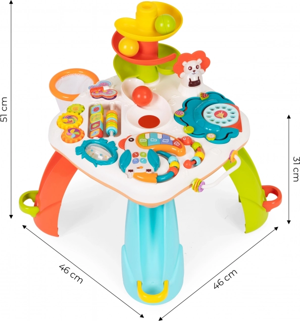 Образователната масичка е не само чудесен начин за прекарване на време, но и за подкрепа на развитието на детето. Играчката има много манипулативни елементи, като музикален тукан, дрънкалка, цветни мъниста, въртящи се играчки и телефонен циферблат, които помагат за развитие на фината моторика и координацията.