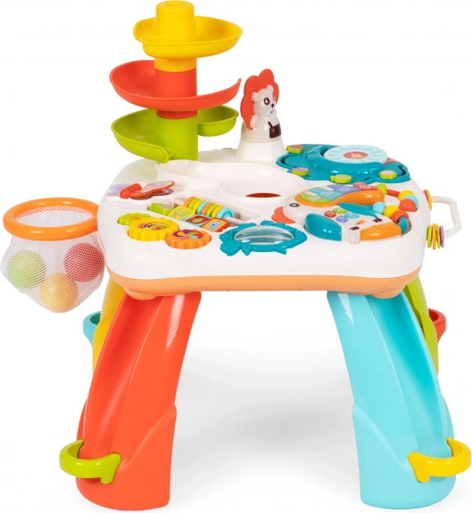 Масичката включва също пързалка с топчета, която подпомага експериментирането и развитието на когнитивните умения, като разбиране на причинно-следствени връзки и пространствено мислене.
