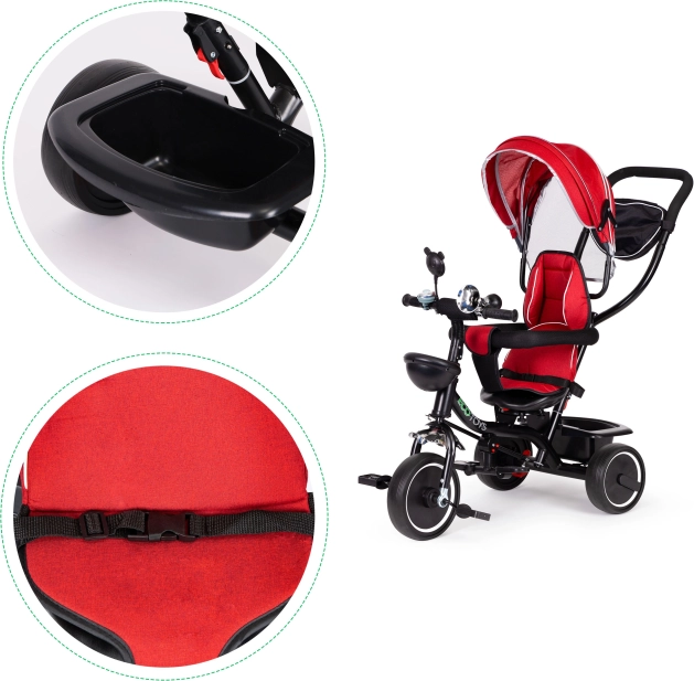 Триколката е оборудвана с меко облегало, предпазни колани и сгъваем сенник за защита от слънце и дъжд. Специално е проектирана за малки деца, за да се качват по-лесно на седалката.