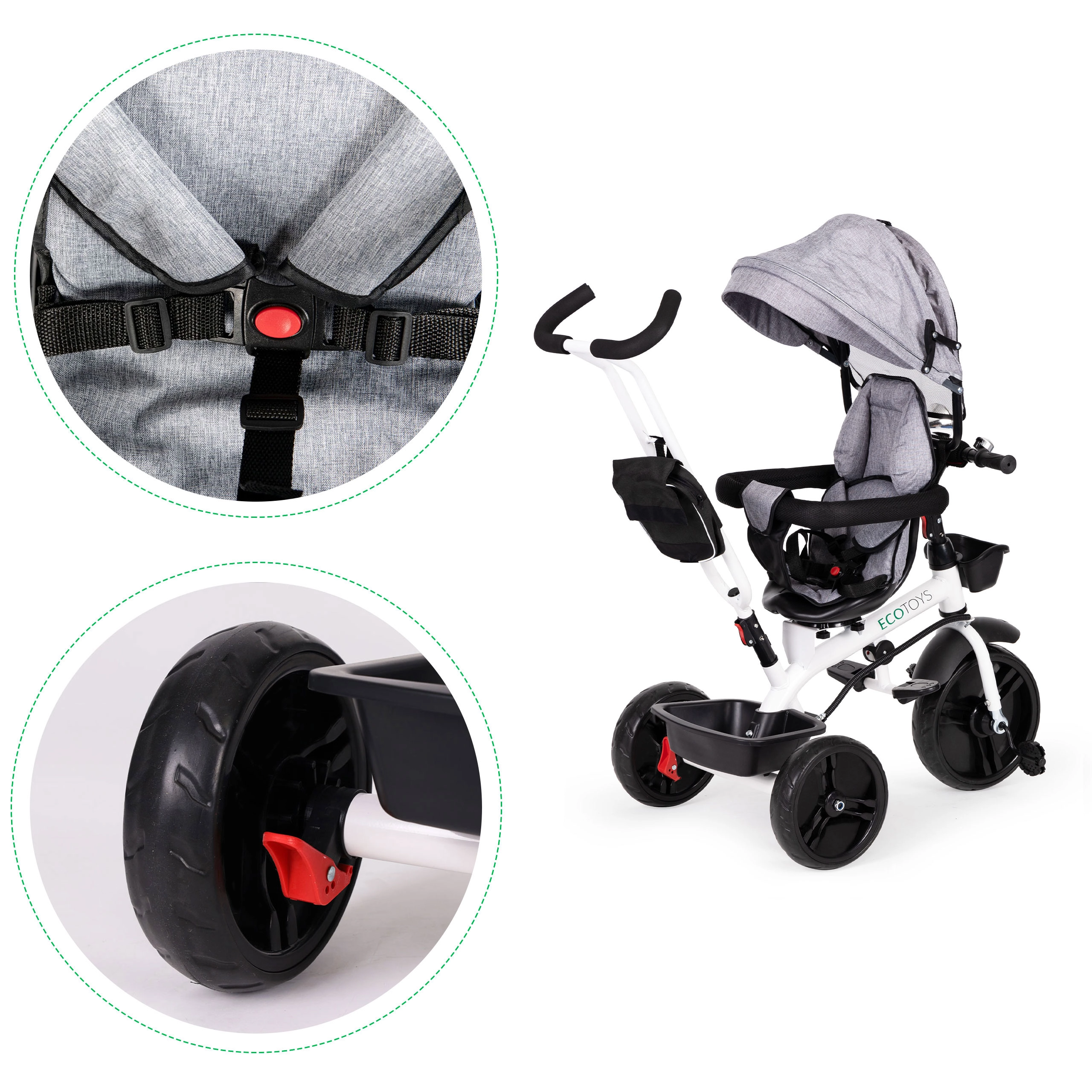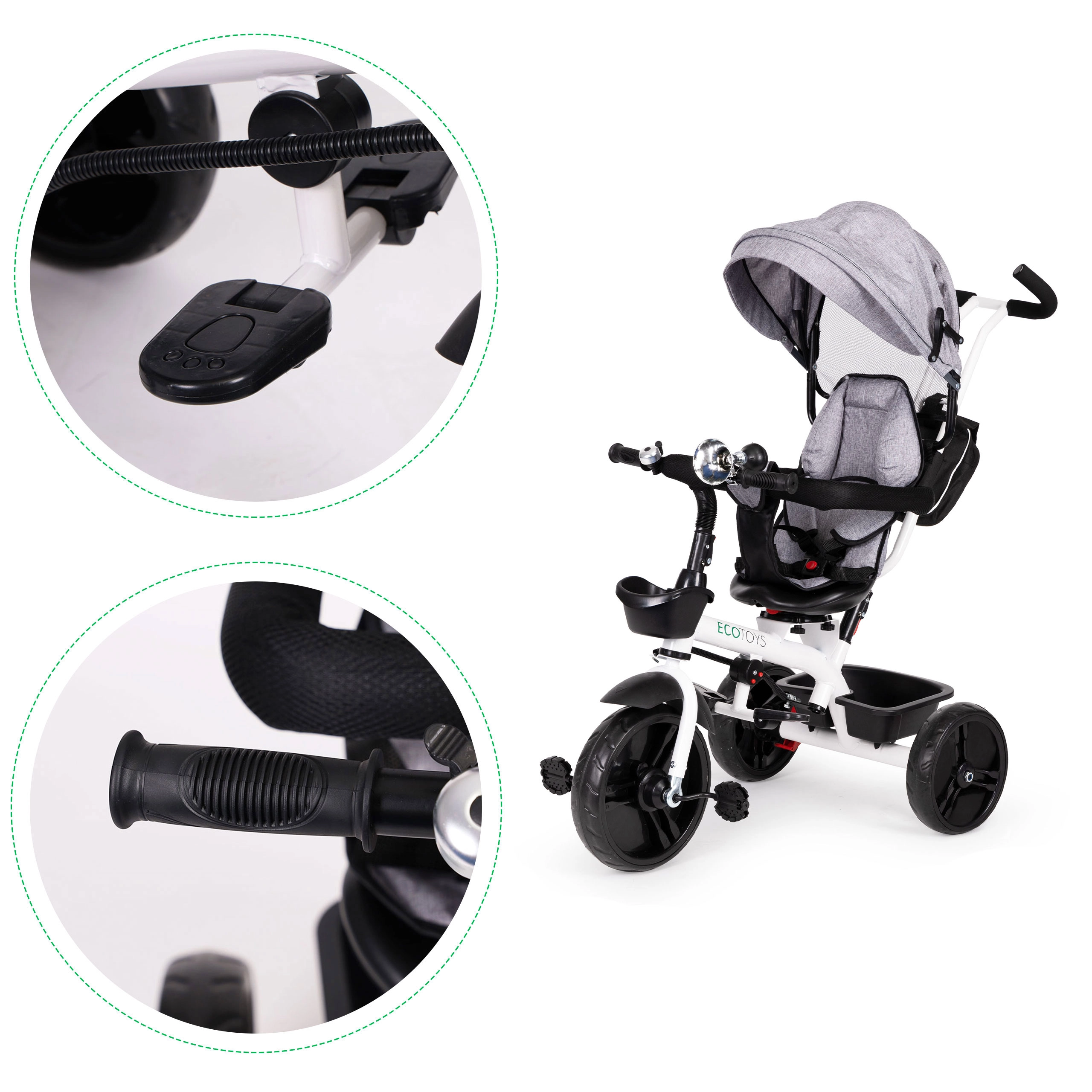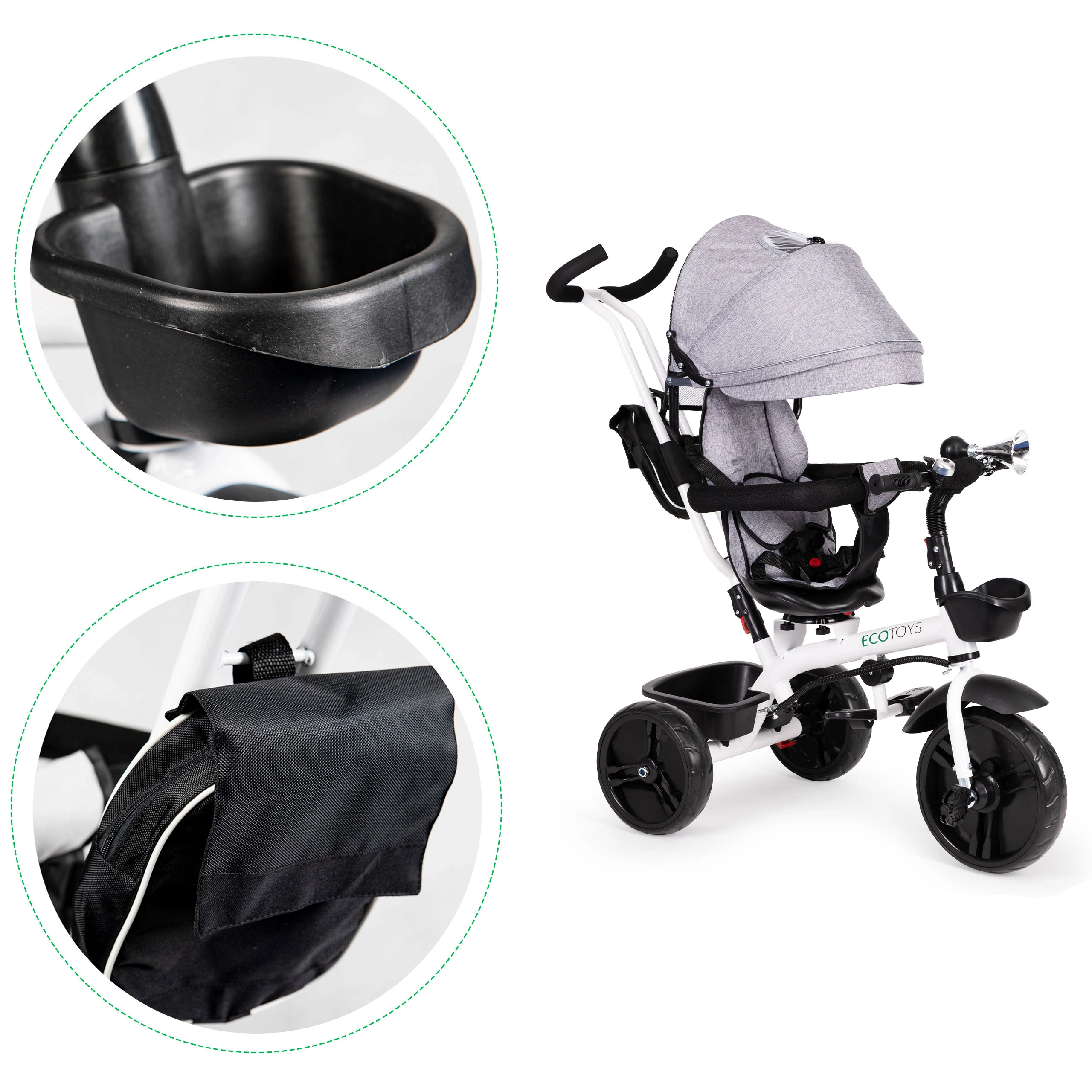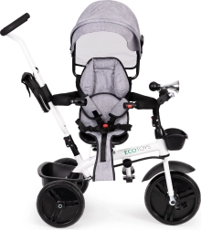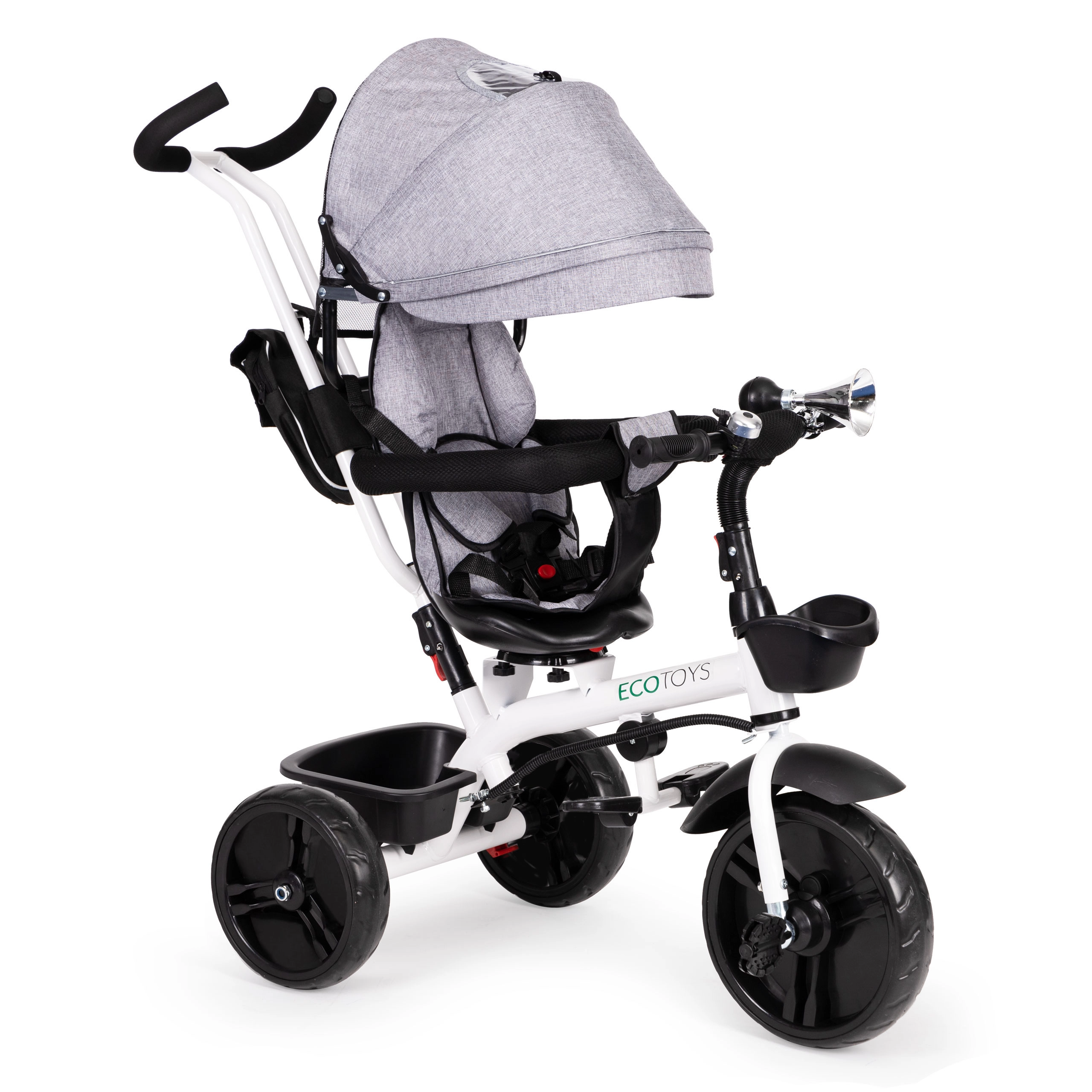 Тази мултифункционална триколка расте заедно с вашето дете: от режим с родителско водене до самостоятелно каране. Въртящата се седалка 360° позволява позиция с лице към родителя за по-добър контакт или по посока на движението за любопитните изследователи. Полстерираната седалка, 5-точковият предпазен колан и предпазната дръжка дават спокойствие, а регулируемият сенник защитава от слънце и лек дъжд.