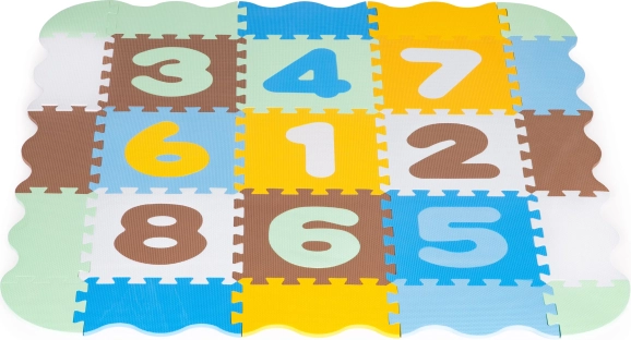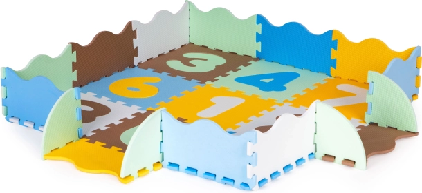 Елементите се подреждат като пъзел и позволяват да се създават различни форми и практично ограждение, което предотвратява търкалянето на играчките извън зоната. Изваждащите се числа подпомагат визуалното учене, развитието на фината моторика и въображението – от частите могат да се строят и прости 3D конструкции, като кубчета или кула.