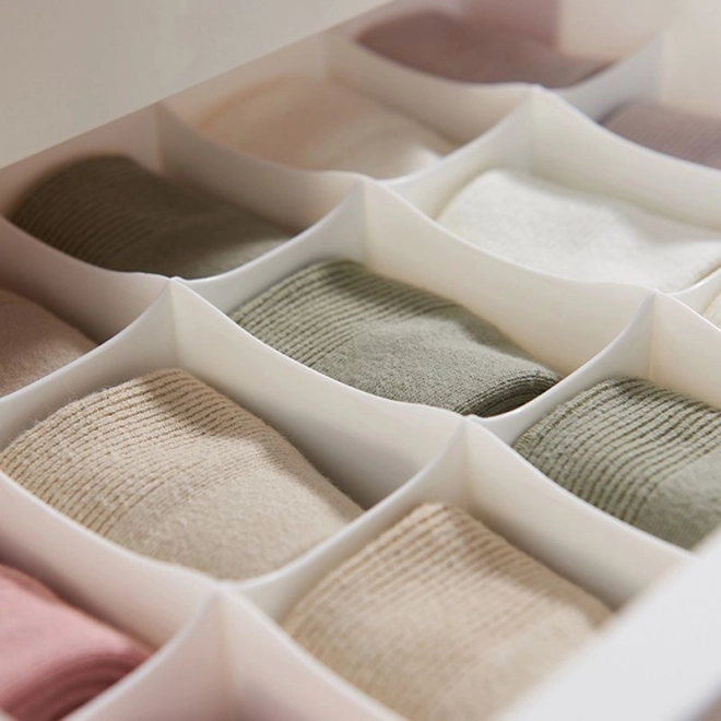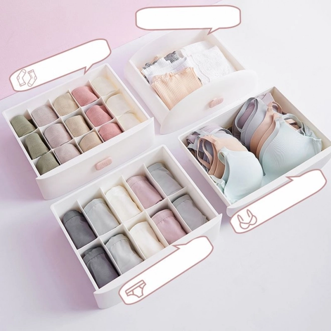 - 1× чекмедже за сутиени; 1× чекмедже с 15 отделения (чорапи); 1× чекмедже с 10 отделения (бикини); 1× универсално чекмедже без прегради