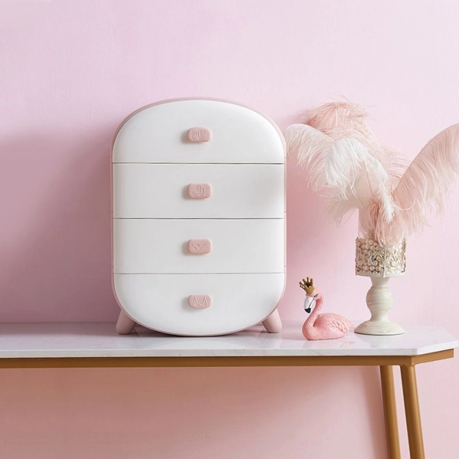 Заоблените ръбове, модерният дизайн и нежният розово-бял цвят отлично се вписват в интериора. Скринята е лека, стабилна и лесна за поддръжка – достатъчно е да я забършете с влажна кърпа. Може да послужи и като оригинално нощно шкафче или помощник на тоалетката.