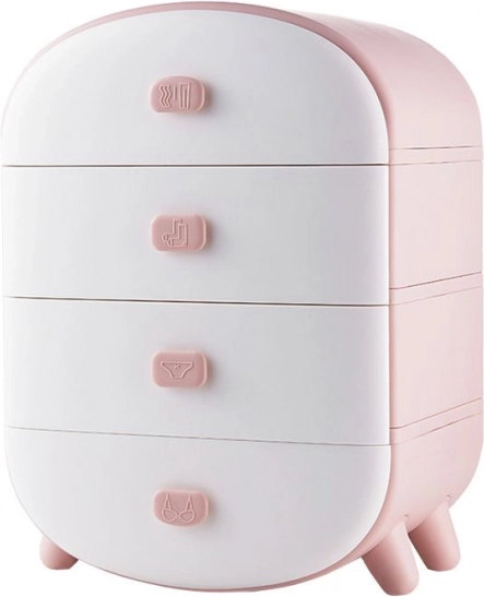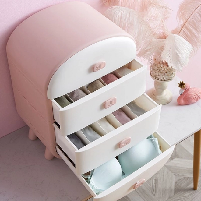 Стилна пластмасова скриня с 4 просторни чекмеджета в нежна розово-бяла комбинация, която помага да поддържате перфектно подредено бельо. Практични прегради и органайзери за сутиени, чорапи и бикини, ясни пиктограми на дръжките и компактни размери за спалня или гардеробно помещение.