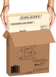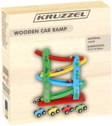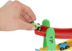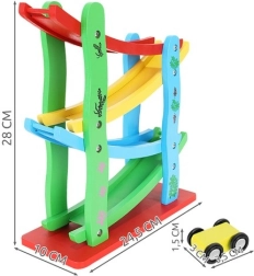 Дървеното състезателно трасе за коли не е само забавно допълнение, но и образователен помощник. Разполага с 4 цветово разграничени нива, които подпомагат разпознаването на цветовете. Благодарение на конструкцията си позволява плавно спускане на количките, което служи за наблюдение на причинно-следствени връзки.