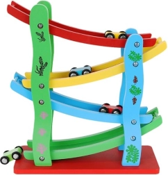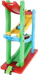 Комплектът включва дървена пързалка с 4 цветни писти и 4 колички. Всичко е изработено от дърво, което гарантира висок стандарт на безопасност.