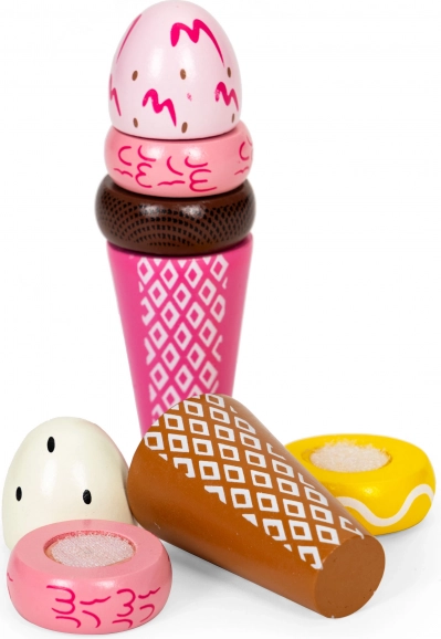 Дървеният комплект сладоледи е чудесно обогатяване за всяко детско пространство. С елементи, които се свързват посредством специално велкро, децата могат да създават свои уникални сладоледени изкушения, като развиват творческите си способности и разпознаването на форми. Всеки елемент е прецизно изработен от издръжливо дърво, което осигурява както естетическа, така и дълготрайна стойност на играчката. Използваните бои са безопасни за деца.