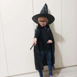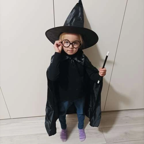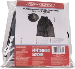 Този стилен костюм на магьосник предлага всичко, от което децата се нуждаят за впечатляващо и безопасно превъплъщение. Лекото наметало от приятен материал елегантно се спуска и благодарение на връзките стои добре на място. Островърхата шапка след изваждане се разгръща сама и създава ефект „уау“. Кръглите очила без стъкла са удобни и безопасни при игра, а пръчката от устойчив пластмасов материал чудесно допълва всеки трик.