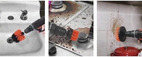 Комплектът от нежни четчици и четки почиства решетки, фуги и колела. Косъмчетата достигат до детайлите и премахват прах и отлагания без да повреждат повърхностите.