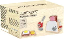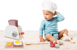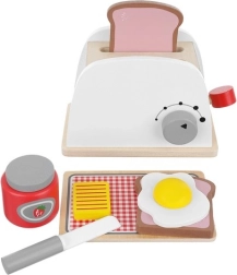 Пълен комплект за закуска за малки готвачи: дървен тостер, 2 филийки тост, яйце на очи, сирене, дървен нож, бурканче сладко и сервиращ поднос. Децата могат да приготвят реалистична закуска, да имитират възрастните и да откриват форми и цветове. Естествените материали са издръжливи и безопасни за ежедневна игра.