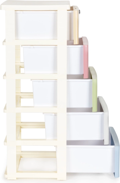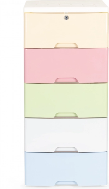 Поддържайте реда стилно и без усилие. Подвижната етажерка с пет цветни чекмеджета е отлична за играчки, козметика и малки аксесоари. Благодарение на здравата пластмасова конструкция и стабилната рамка е подходяща за детската стая и банята, където ще оцените лесната поддръжка и чистия, модерен дизайн.