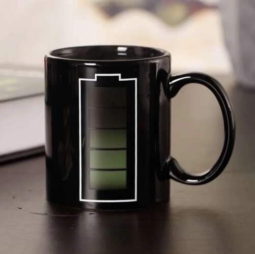 Нуждаете се от презареждане? Тази магическа чаша ви го показва буквално. След наливане на гореща напитка белият контур на иконата на батерията постепенно се запълва със зелено – сякаш батерията се зарежда. Когато напитката изстива, цветът изчезва, така че винаги знаете кога е време за следваща глътка.