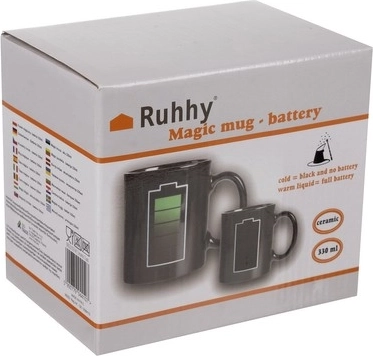Стилна черна керамична чаша с термочувствителен печат на батерия, която при наливане на гореща напитка се „зарежда“ в зелено. Магическият ефект пред очите ви показва колко е гореща напитката и придава на всяко кафе или чай забавен и оригинален елемент. Чашата е с обем 330 мл, удобна дръжка и е изработена от безопасна керамика, подходяща за контакт с храни.