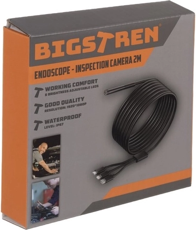 Компактната ендоскопска камера BIGSTREN за телефони предлага Full HD (1920×1080) изображение, 2 m полутвърд кабел, 8 регулируеми LED и сменяеми накрайници (кука, магнит, огледалце). Благодарение на водоустойчивост IP67 и широката съвместимост с Android и iOS чрез приложението ANESOK лесно ще инспектирате тръби, двигателни отделения и трудно достъпни места.