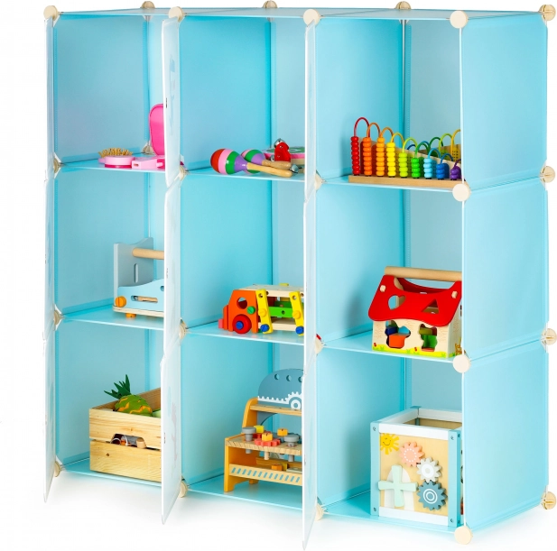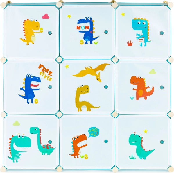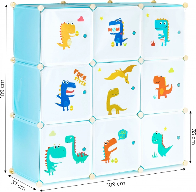 Този модулен гардероб за детска стая съчетава забавен дизайн с ежедневна функционалност. Деветте затварящи се кубчета с цветни принтове на динозаври правят пространството по-прегледно и мотивират децата самостоятелно да поддържат ред. Благодарение на издръжливите полипропиленови панели и подсилената метална рамка гардеробът е лек, но стабилен.
