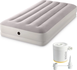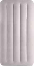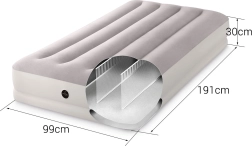 Практичен надуваем матрак от марката INTEX с размери 191 × 99 × 30 cm за удобен сън на един човек у дома и по време на път. Благодарение на технологията Dura-Beam Fiber е стабилен и добре поддържа тялото. Приятната велурена (flock) повърхност е мека на допир и не се хлъзга. В комплект е компактна USB електрическа помпа за бързо напомпване и изпускане и транспортен сак за лесно пренасяне.