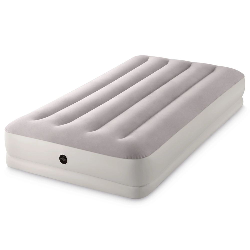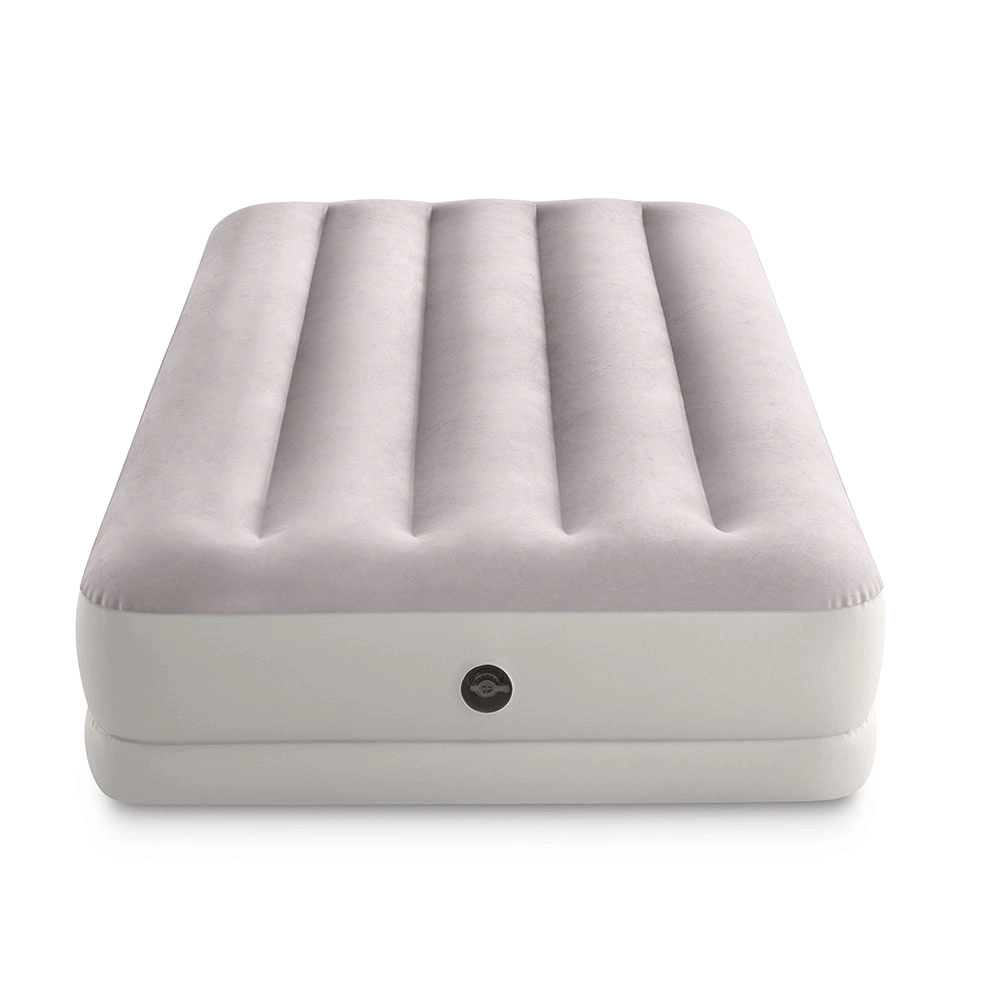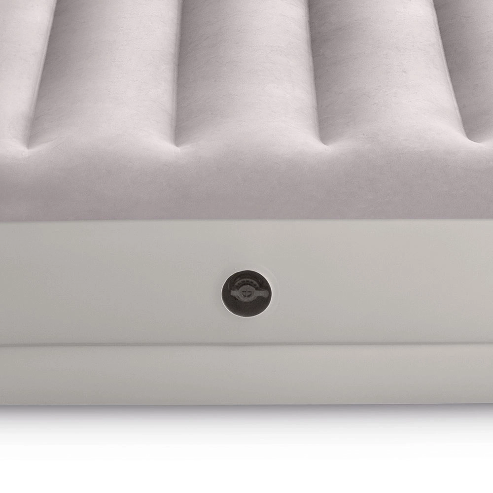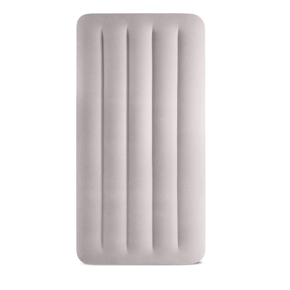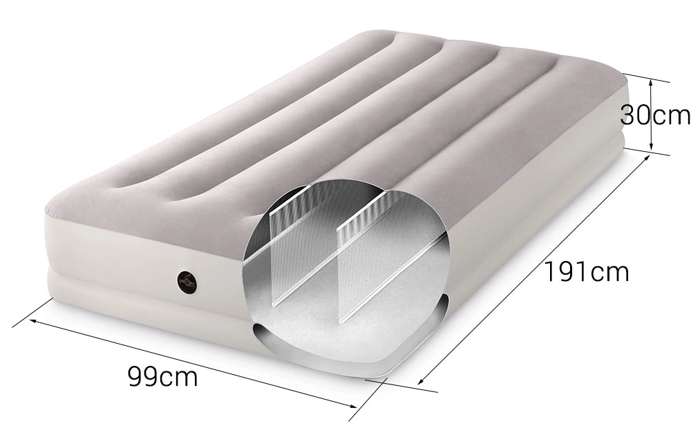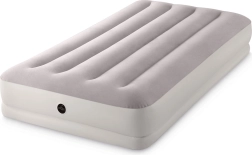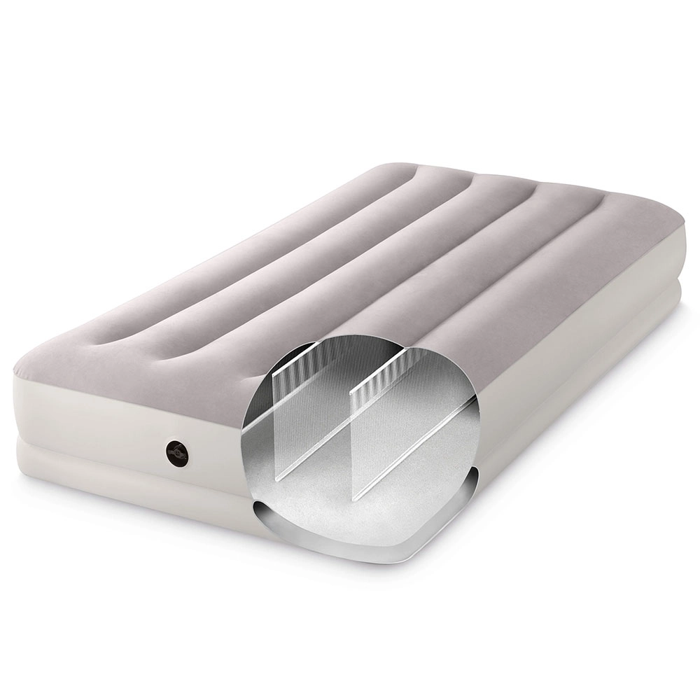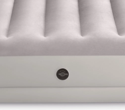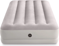 Надуваемото легло INTEX съчетава издръжлив PVC материал с мека флокирана повърхност, която е приятна на допир и подобрява комфорта на съня. Повдигнатата конструкция с надлъжни камери и вътрешни усилвания осигурява стабилност без люлеещ ефект и надеждна опора на гръбначния стълб.