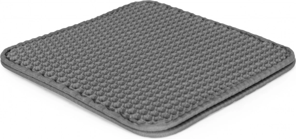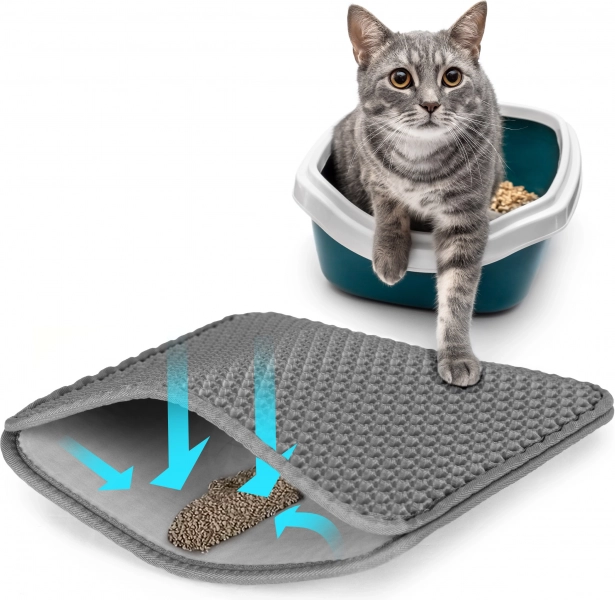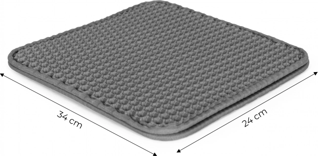 Практична двуслойна подложка за котешка тоалетна в елегантен сив цвят от марката PETSI поддържа зоната около тоалетната чиста. Благодарение на горния слой с мрежеста структура разпилената постелка се улавя, пропада навътре в подложката и лесно се изсипва. Подложката е неслъзгаща, издръжлива, безопасна за лапите и лесна за почистване.
