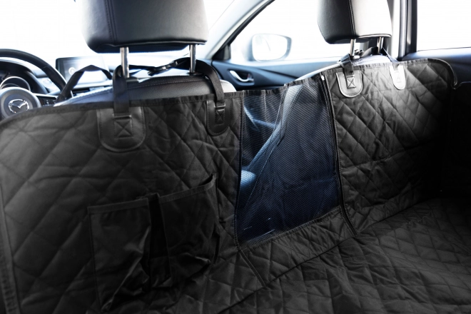 Капитонираното, издръжливо покривало покрива цялата задна седалка и защитава тапицерията от косми, кал и надраскване. Двата джоба държат повода, лакомствата и дребните вещи винаги под ръка.