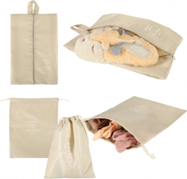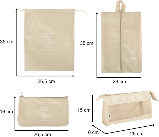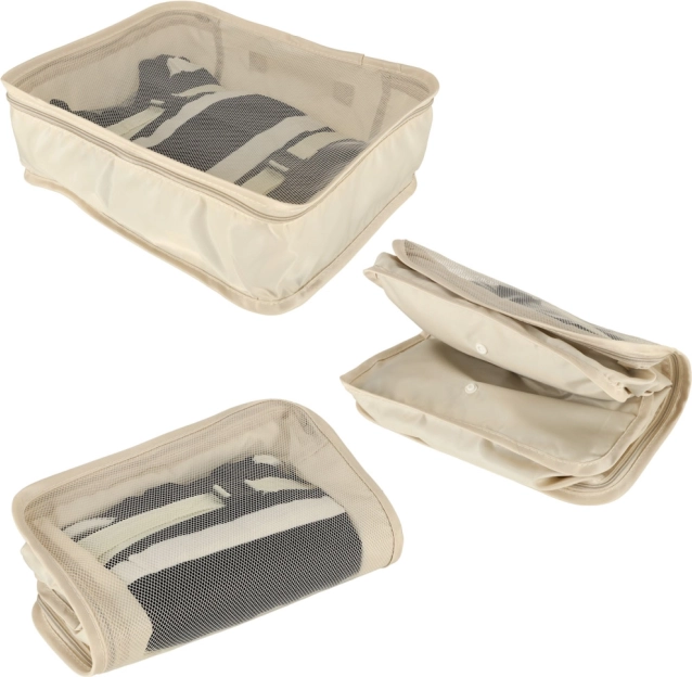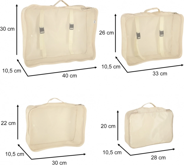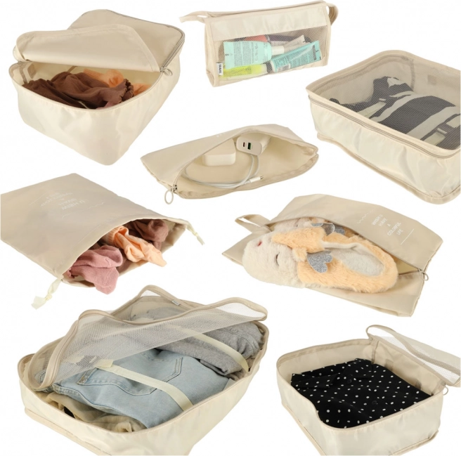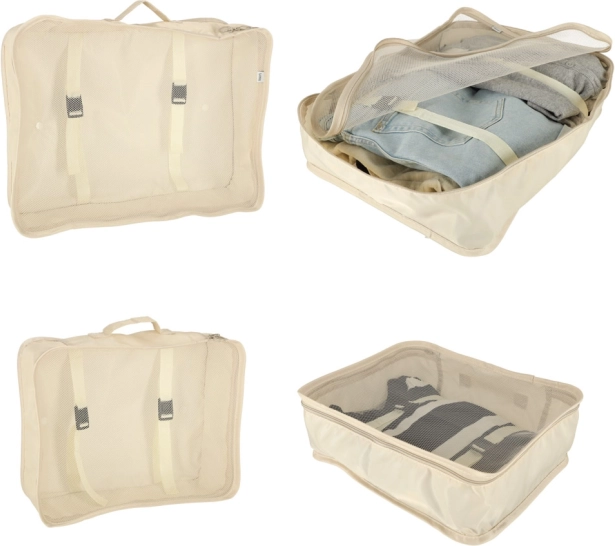 Внесете ред в багажа си веднъж завинаги. Този 8-частов комплект пътнически организатори в елегантен бежов цвят включва четири кубчета за дрехи, чанта за обувки, козметична несесер, торбичка със стягане и малък джоб за дребни вещи. Благодарение на леката и издръжлива полиестерна материя органайзерите са лесни за почистване, устойчиви на замърсявания и перфектни за прегледно подреждане при пътуване и за ежедневна употреба.