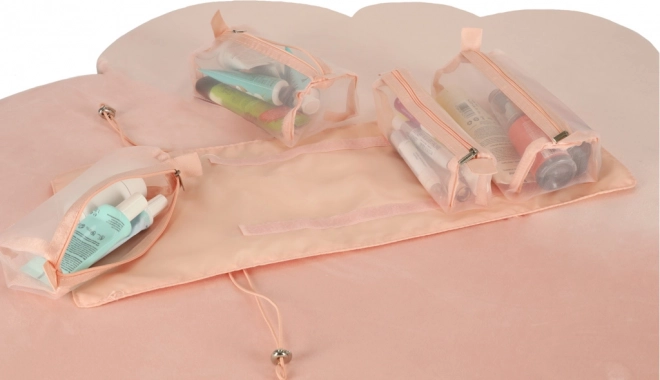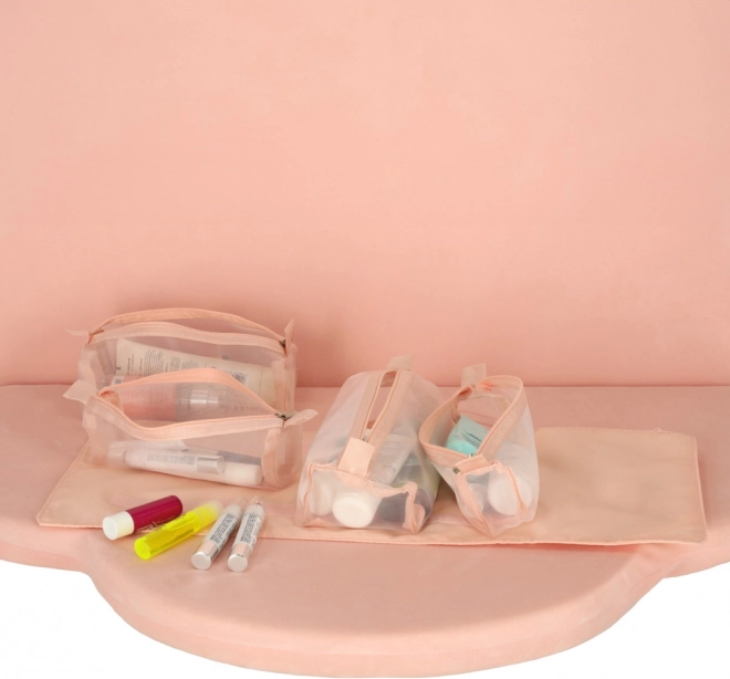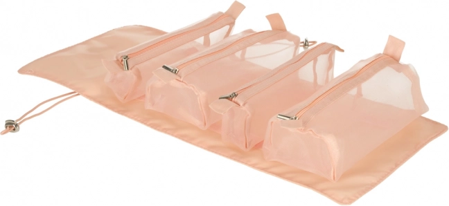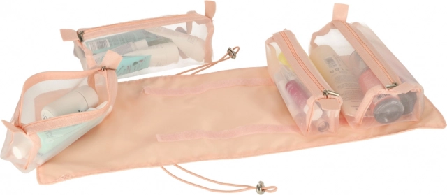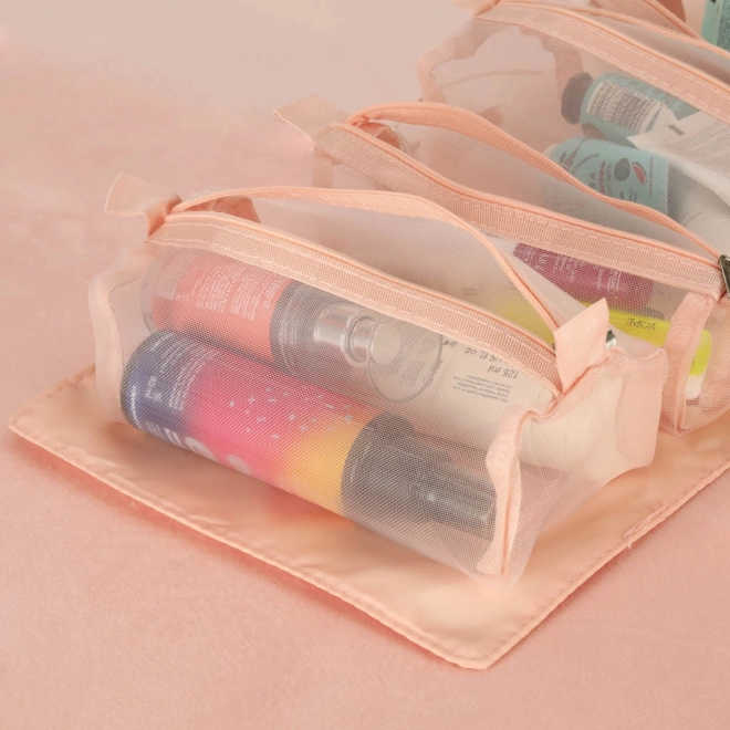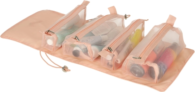 Тази розова козметична чанта е проектирана за тези, които търсят удобство и ефективност при организиране на своите козметични продукти по време на път. Чантата е оборудвана с четири прозрачни отделения с цип, които осигуряват лесен достъп и видимост на съдържанието. Отделенията са изцяло подвижни, което носи висока гъвкавост при употреба.