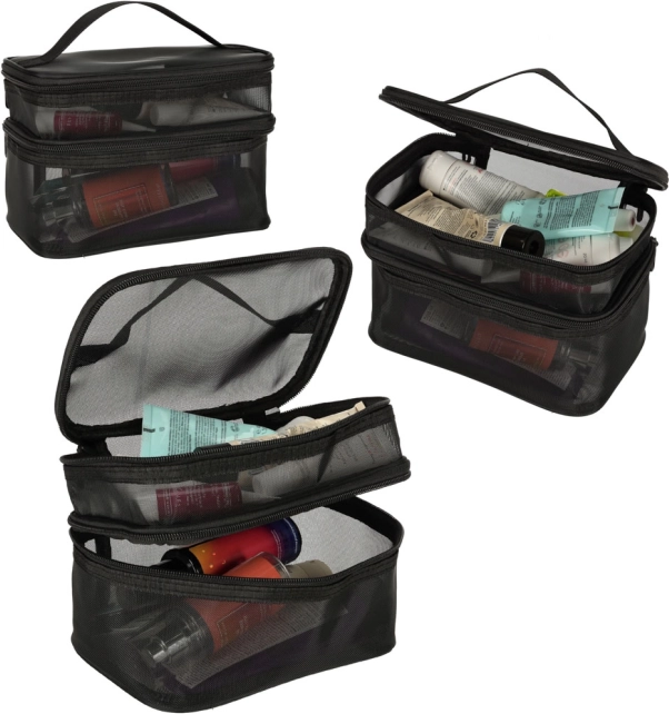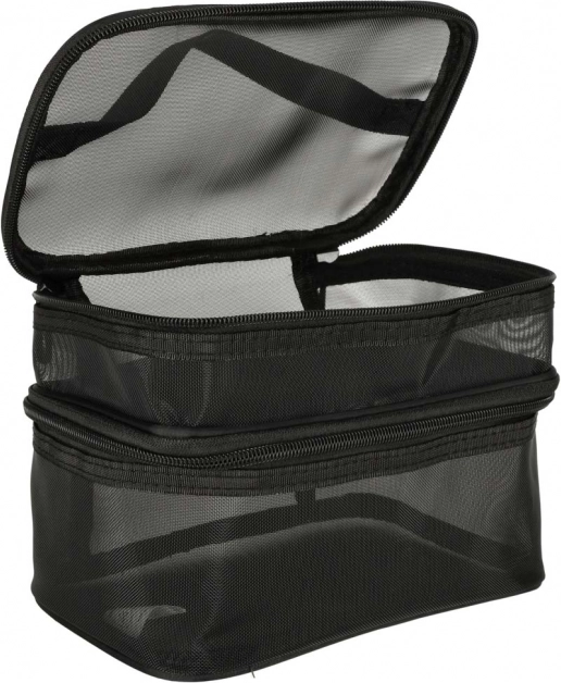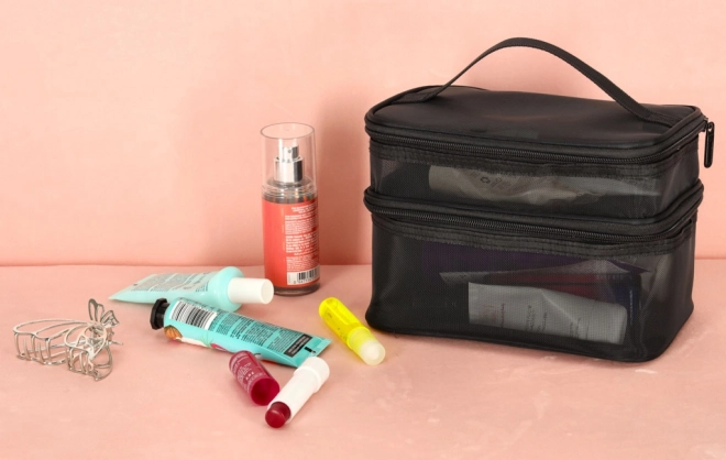 Пътната козметична чанта е незаменима за всяко пътуване. Благодарение на двустепенната конструкция осигурява подреден преглед и съхранение на козметичните принадлежности. Двупосочният цип гарантира сигурност и удобство при използване. Чантата е изработена от дишащ материал, който позволява лесно да се намират съхранените продукти.
