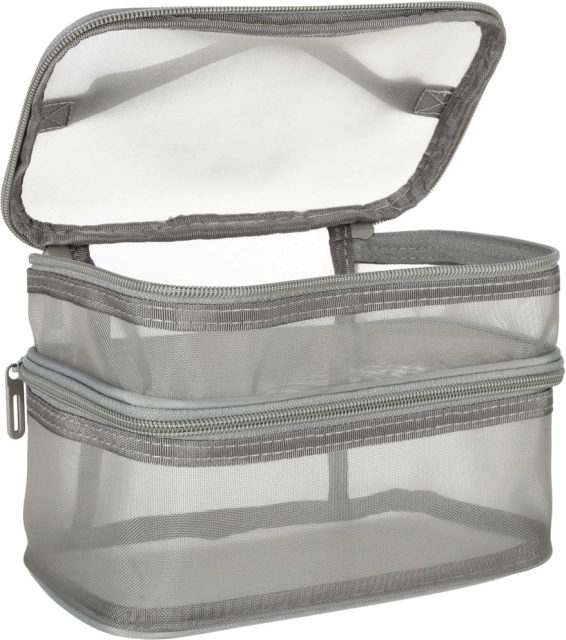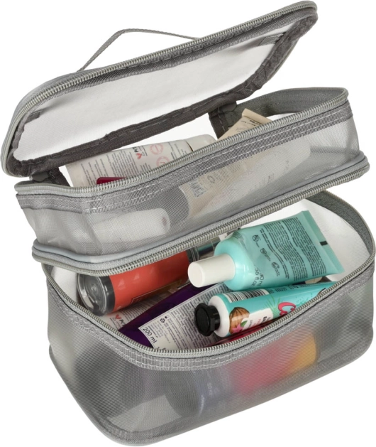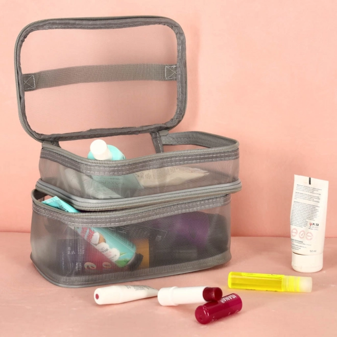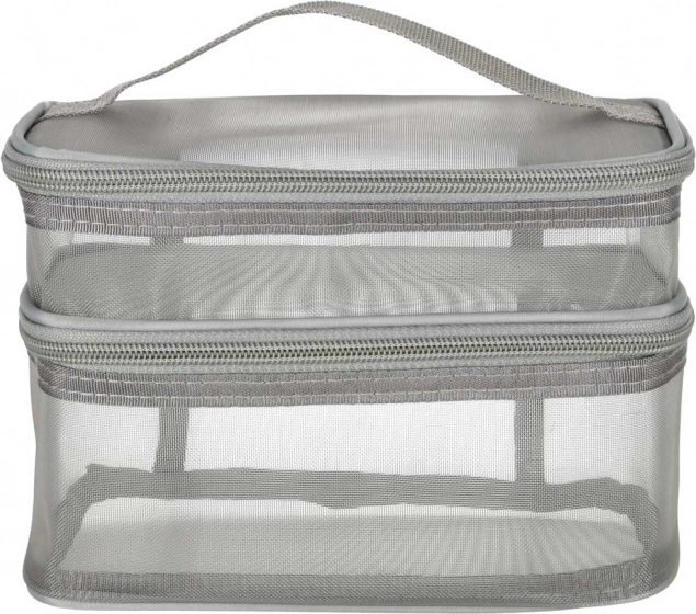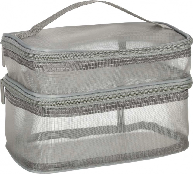 Тази практична козметична чантичка е незаменим аксесоар за всяко пътуване. Разполага с двукомпонентен дизайн, който позволява лесна организация на козметика и други лични вещи. Изработена е от мрежест материал, който улеснява откриването на съхранените продукти.