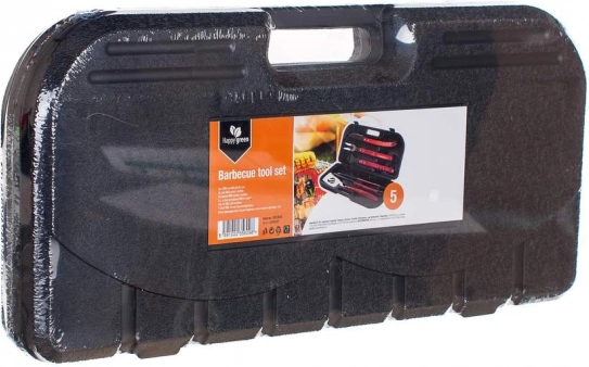 - 5‑частов комплект: четка за почистване на скара (48 cm), щипки със зъбци (45 cm), широка шпатула (48 cm), нож за разфасоване (острие 45 cm) и двузъба вилица (46 cm).