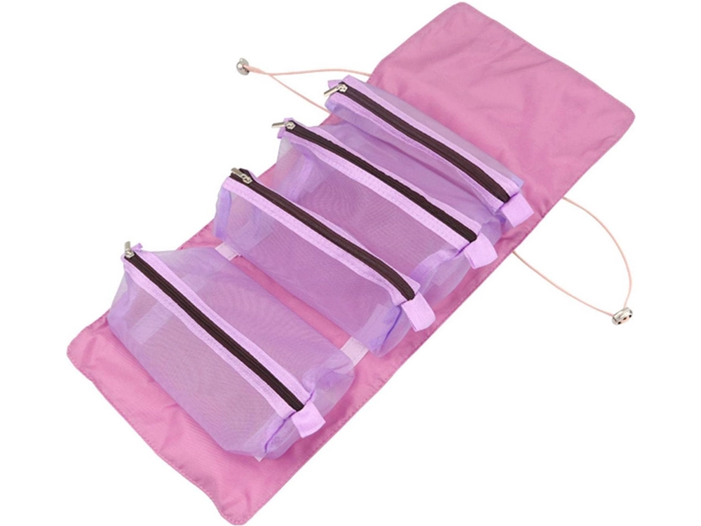 Край на хаоса в тоалетната чанта. Този навиваем козметичен органайзер 4 в 1 предлага четири просторни, прозрачни джоба с цип, които могат да се изваждат и пренареждат според нуждите благодарение на велкро лентите. След събиране се пристяга с еластични ленти и стои стабилно.