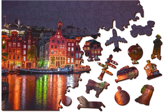 Този уникален дървен пъзел ще зарадва всеки любител на подреждането. Благодарение на лазерното изрязване пъзелът има гладки ръбове, които лесно се съединяват. Съдържа общо 150 елемента, от които 30 са с уникални форми като животни или известни сгради, добавящи образователен елемент и визуална естетика. Пъзелът е проектиран като 2 в 1, което означава, че можете да го подреждате както по изтънчения нощен мотив на Амстердам, така и по модела на задната страна.
