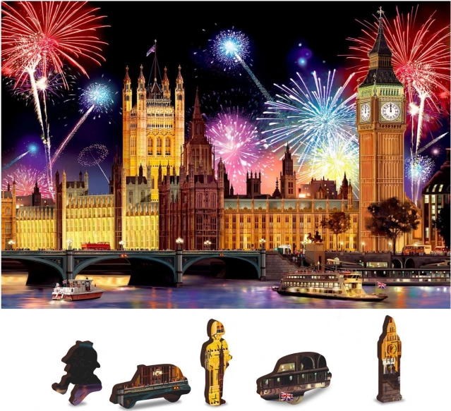 Донесете частица от Лондон у дома с впечатляващия дървен пъзел Нощен Лондон 2в1. Тази мозайка съдържа общо 150 части, от които 30 са уникално оформени, изобразяващи емблематични сгради и символи на столицата на Великобритания. При подреждане се подгответе за по-висока трудност благодарение на разнообразно оформените части, които са предизвикателство дори за опитни любители на пъзели.