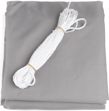Подсилените ъгли с метални D-образни халки и включените въжета позволяват бързо и сигурно опъване между стени, колове или дървета.
