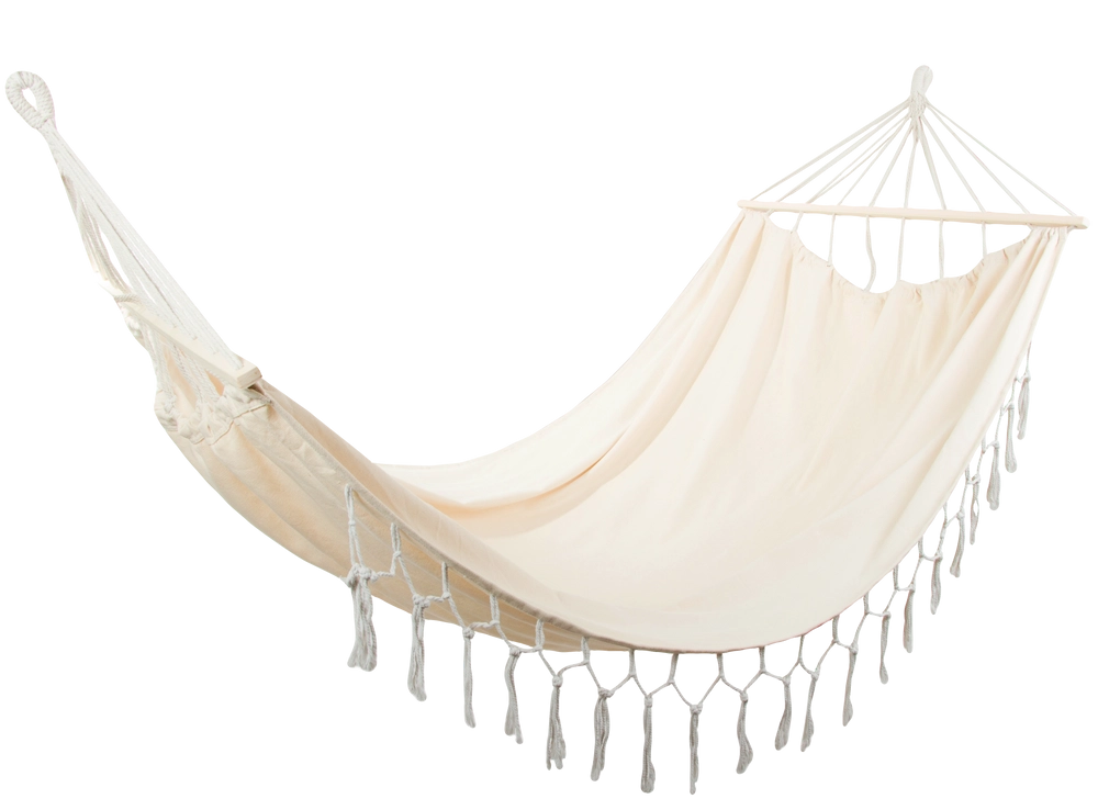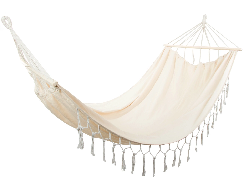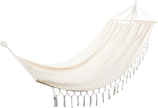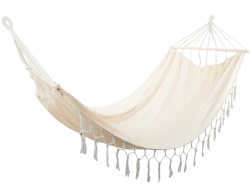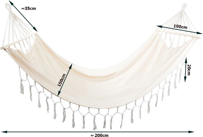 Този бохо хамаак е идеален за двойки и за всеки, който цени удобството и стила. Широката площ за лежане с дървени разпънки държи плата равномерно разгърнат, така че да се настаните удобно и да се насладите на спокойствие в градината, на балкона или по време на почивка.