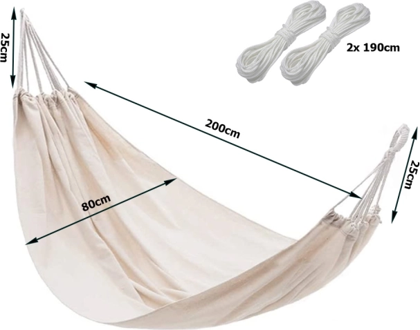 Монтажът е лесен – достатъчно е да завържете двата края за дървета, колове или куки. Гъсто тъканите окачващи въжета разпределят тежестта равномерно, което повишава комфорта и издръжливостта. Материята може да се пере в пералня, така че поддръжката на чистотата е лесна.