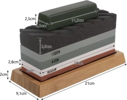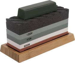 Зърнометриите 400/1000/3000/8000 покриват всичко – от агресивно сваляне на материал до фино полиране. Бързо възстановяване на режещия ръб и перфектно финално заточване на едно място.