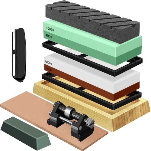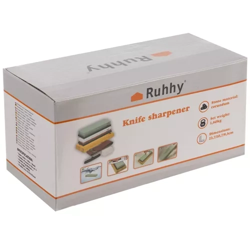 Пълен комплект водни шлайф камъни RUHHY за прецизно заточване на ножове и инструменти. Включва 4 зърнометрии 400/1000/3000/8000, изравнителен камък, водачи и кожен ремък за полиране. Благодарение на стабилната бамбукова основа и противоплъзгащите подложки заточването е безопасно и удобно. Идеален за кухненски и външни ножове, длета и ножици – за бързо възстановяване на острието, гладко финално заточване и дълъг живот на остриетата.