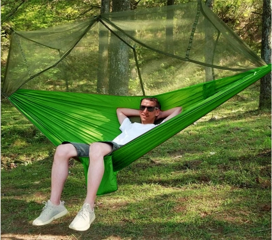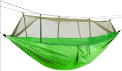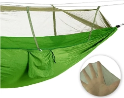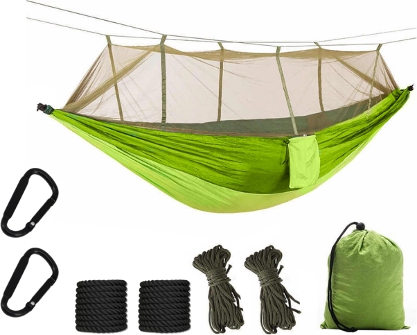 - Хамак с мрежа против комари, 4× въже, карабинери, интегриран калъф/джоб