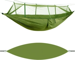 Здрав и лек хамак с интегрирана мрежа против комари за удобна почивка сред природата. Осигурява надеждна защита от насекоми, отлична вентилация и лесно окачване между дървета. Благодарение на компактната торбичка/калъф е идеален за къмпинг, туризъм и градина.