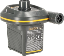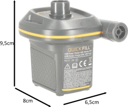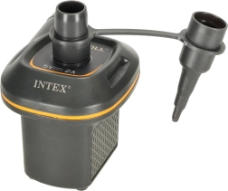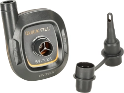 Компактната електрическа помпа INTEX Quick-Fill с USB 5V/2A бързо надува и изпуска матраци, басейнови пояси и други надуваеми изделия. Предлага двупосочна работа, висок дебит 150 л/мин и универсални накрайници за различни вентили. Благодарение на малките размери е идеална за път и може да се захранва от зарядно, външна батерия или който и да е USB порт.