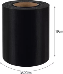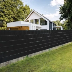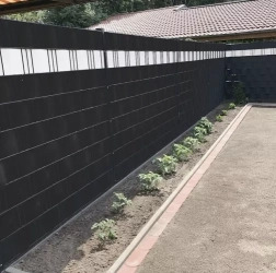 Непрозрачната черна лента създава елегантен екран, подобрява акустичния комфорт и защитава от вятър. Идеална за панелни огради и балкони.