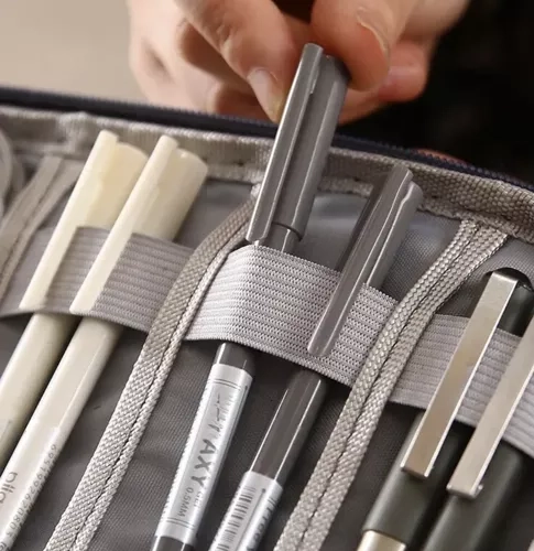 Вътре ще откриете 6 мрежести джоба за бърз преглед и 8 еластични ластика за стабилно фиксиране на аксесоарите. Закопчаването с цип предпазва съдържанието, пянената подплата омекотява ударите, а каишката за китка улеснява пренасянето. Подходящ за работа, учение и пътуване.