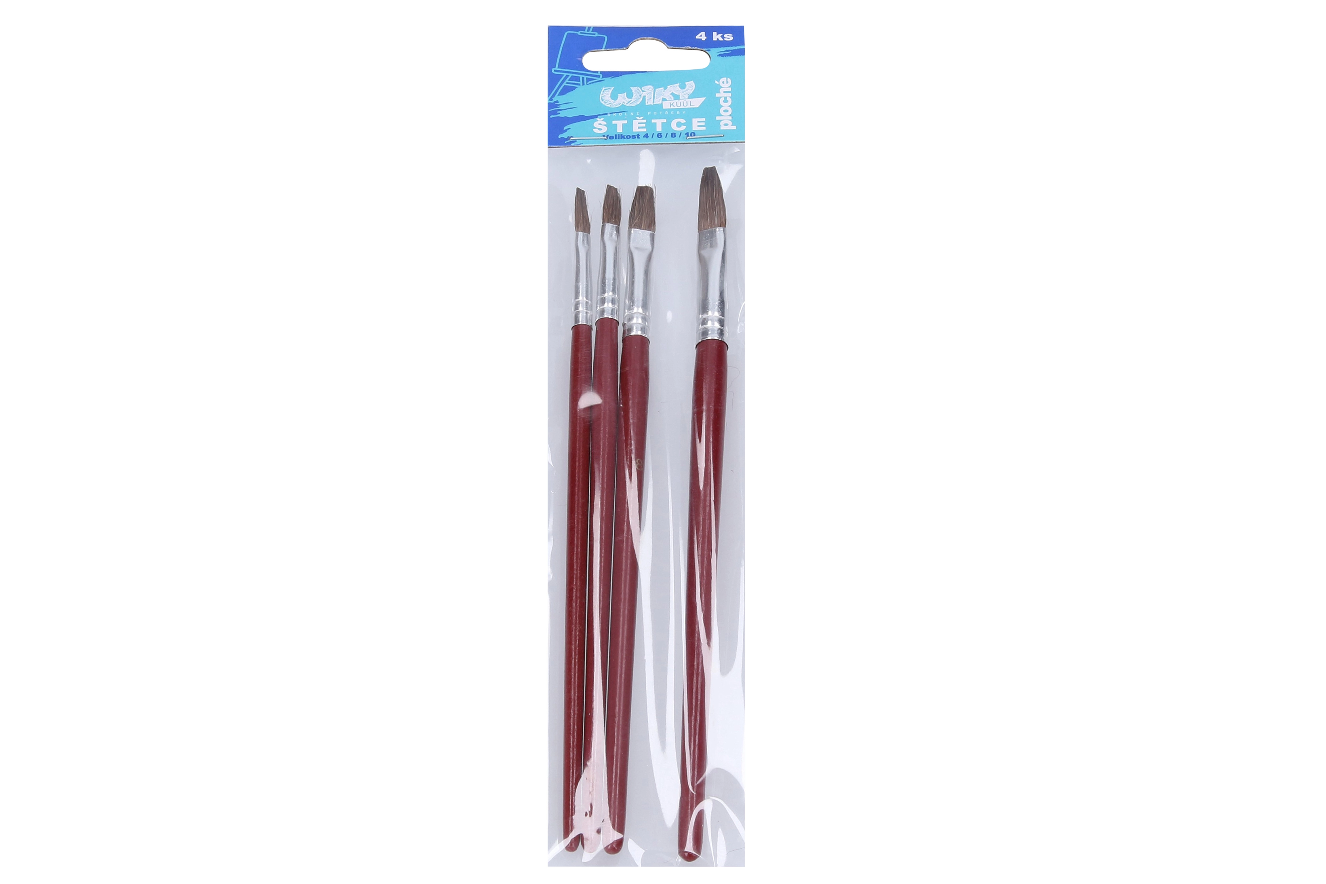 Този комплект съдържа четири плоски четки с различни размери, които са отлично подходящи за разнообразни техники и стилове на рисуване.