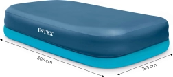 Практичното покривало INTEX 58412 надеждно пази водата в правоъгълни басейни 305 × 183 cm (съвместимо и с 262 × 175 cm) от замърсявания. Благодарение на издръжливия винил, отточните отвори срещу задържане на дъждовна вода и връвчиците за закрепване се използва лесно и помага басейнът да остане чист и готов за къпане.