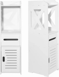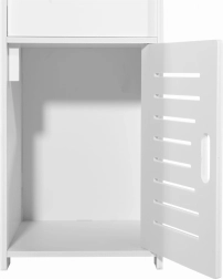Този тесен бял шкаф е проектиран да използва ефективно дори силно ограничени пространства. Открити и затварящи се отделения позволяват да скриете почистващи препарати или козметика и едновременно с това да държите често използваните вещи под ръка. Въздушна, модерна визия придава лекота и чистота на интериора.