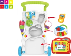 Открийте практичното 2в1 – проходилка за първите стъпки и едновременно многофункционален игрови център, който расте заедно с вашето дете. Голямата основа осигурява отлична стабилност, задните колелца с противоплъзгаща подложка помагат за безопасно спиране, а интерактивният панел предлага много умни забавления.
