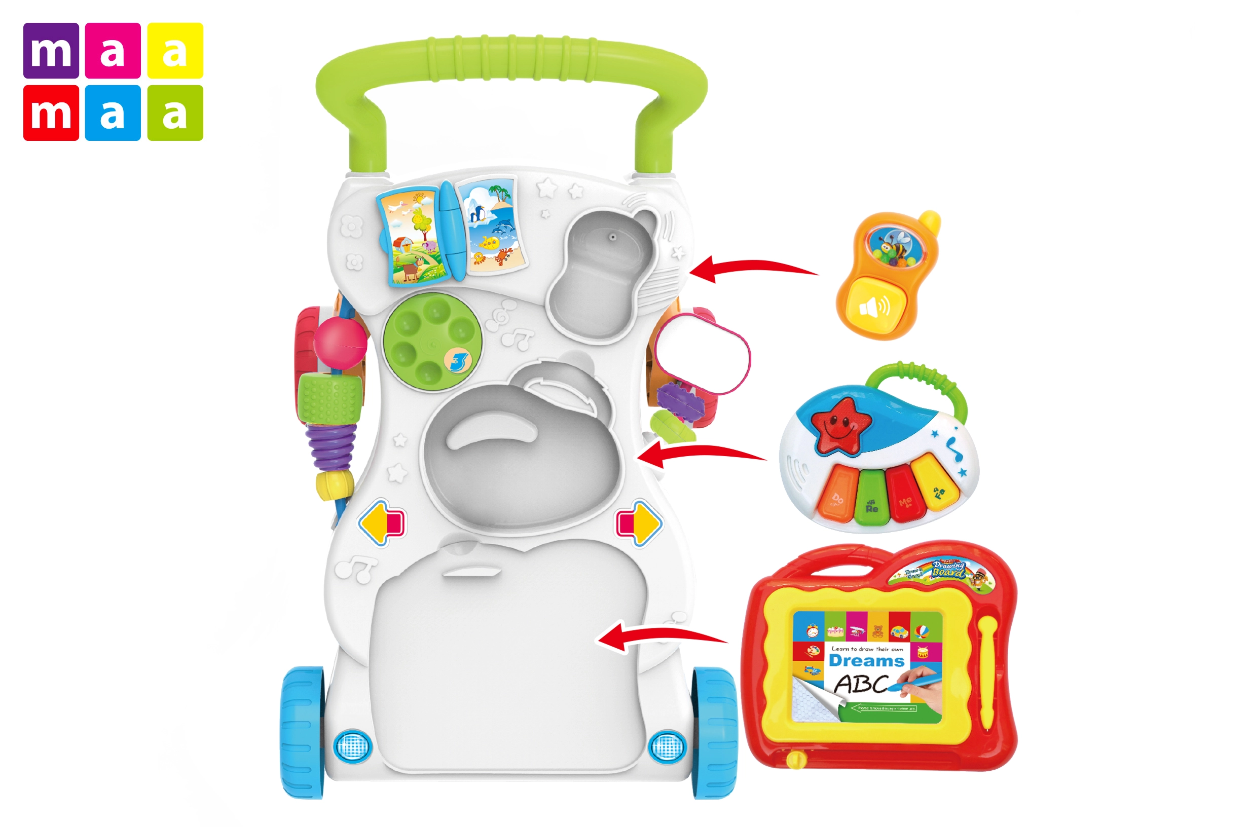 В комплекта има табло за рисуване, минителефон и свирещо пиано, които могат да се използват и самостоятелно. Децата ще обикнат огледалцето със защитно фолио, въртящите се форми отстрани и книжката за разглеждане. Всичко е проектирано за развитие на фината и грубата моторика, учене на числа, разпознаване на цветове и форми, както и подкрепа на креативността.