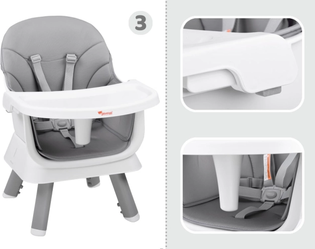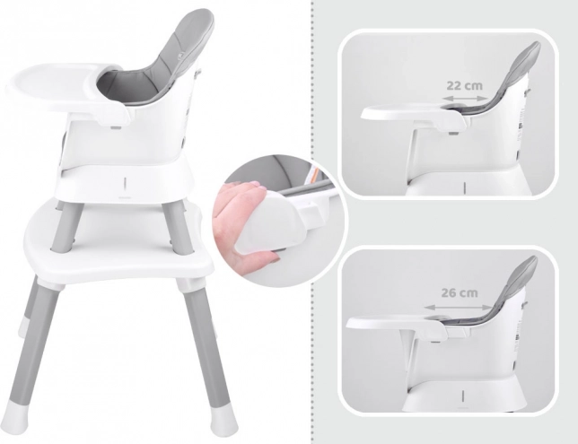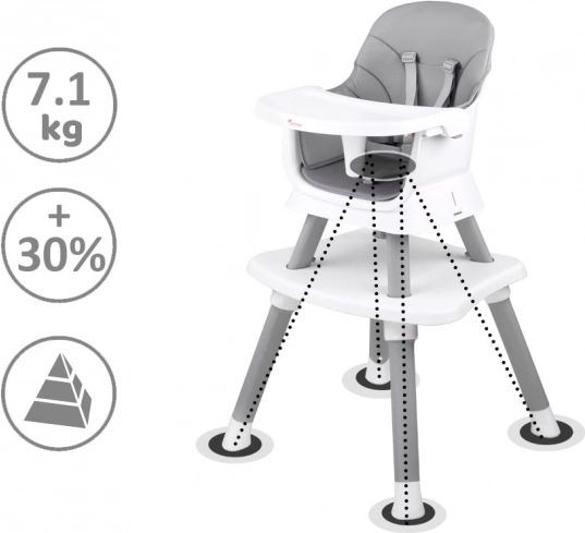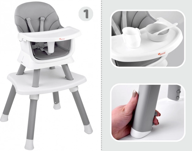 Това многофункционално столче 6 в 1 е идеално за първите захранвания и ежедневното хранене. Благодарение на обмисления дизайн лесно го адаптирате към растежа на детето и различни ситуации – от хранене на масата до игра и творчество. Свалящата се табла се измива бързо под течаща вода или в съдомиялна, тапицерията е дишаща и лесна за почистване.