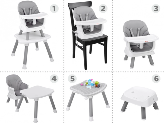 Практичното детско столче за хранене 6 в 1 расте заедно с вашето дете от 6-месечна възраст. Предлага модулна конструкция, безопасни 5-точкови колани, лесна за почистване и дишаща тапицерия, сваляща се табла и неплъзгащи се крачета. Благодарение на различните конфигурации служи като високо и ниско столче, приставка за трапезен стол, самостоятелно столче с масичка и игрална маса за конструкторни блокчета.