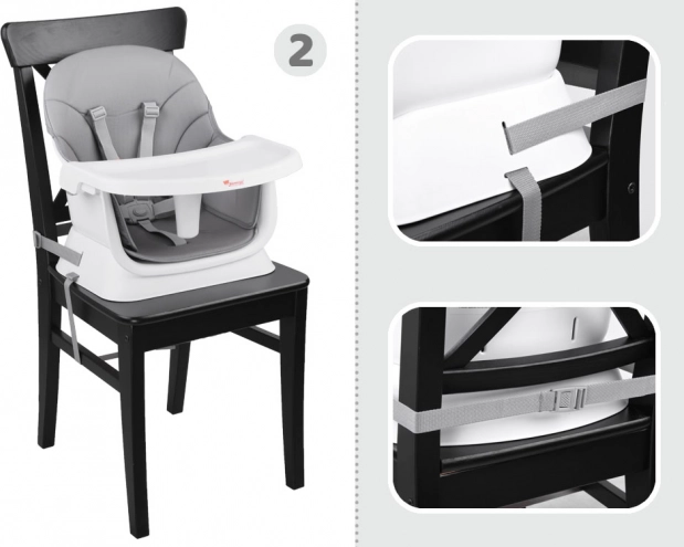 Безопасността е гарантирана от 5-точкови колани и предпазител против плъзгане. Неплъзгащите се накрайници на крачетата държат столчето стабилно на място. Сглобяването и превключването между режимите е бързо и интуитивно, за да се съсредоточите върху най-важното – комфорта и радостта на вашето дете.