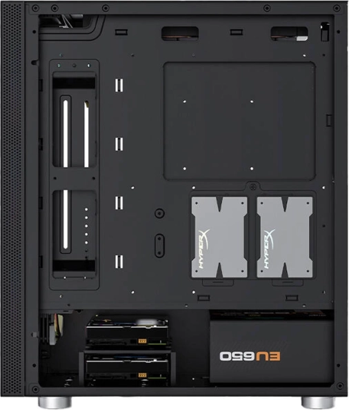 Кутията предлага обмислен въздушен поток и широка поддръжка на охлаждане: отпред до 360 mm радиатор, отгоре 240 mm и отзад 120 mm. Общо побира до 7 вентилатора, така че поддържа ниски температури дори при високопроизводителни системи. Монтажът е улеснен от винтове за ръчно затягане, предвидени позиции за 2× 3,5" HDD и 2× 2,5" SSD, както и чисто управление на кабелите.